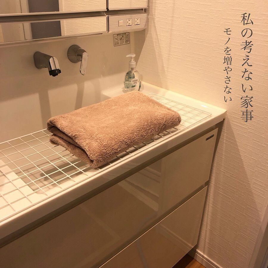 脱衣スペースにタオルや着替えなどを置く場所がないので、洗面台にワイヤーネットを乗せてちょい置き場を確保。お風呂に入るときだけ出して、使わないときには隙間に立てて収納しているそうです。ものを増やさないためのいいアイデアですね!
