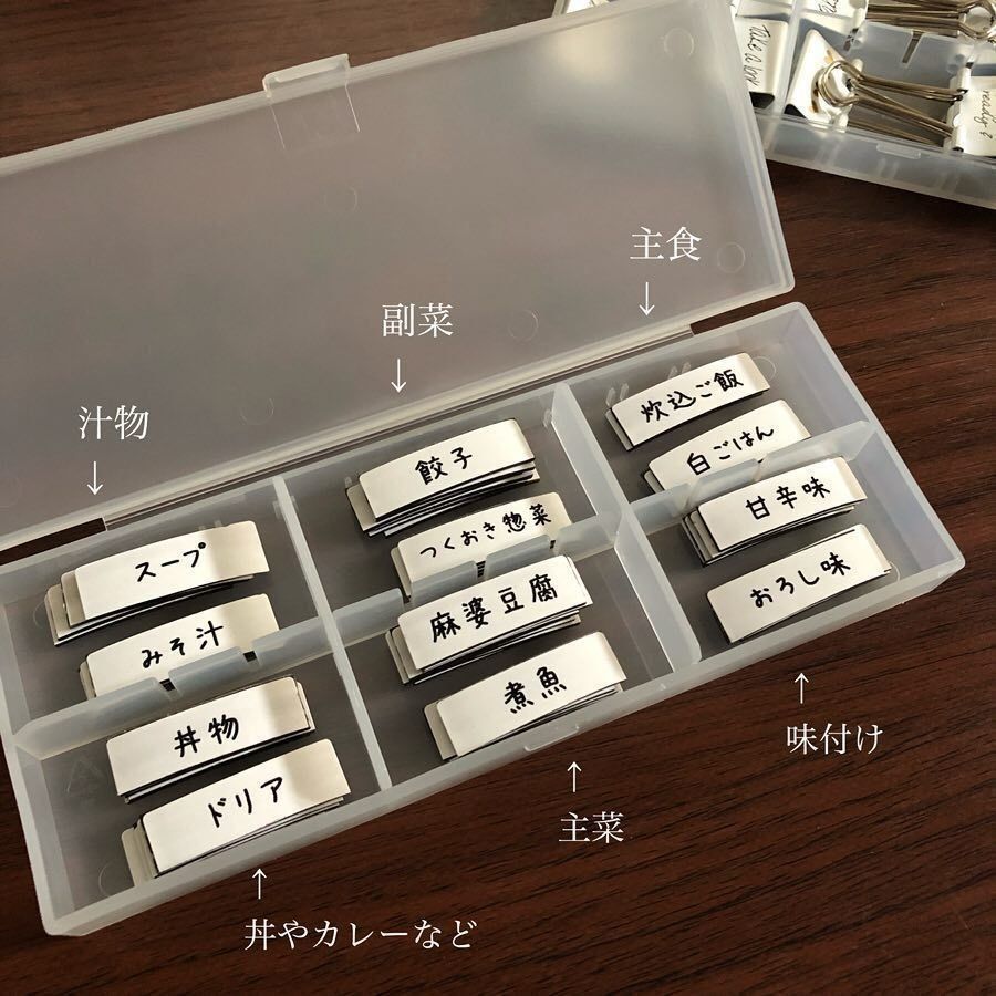 マグネットラベルは、ふだんはケースに収納しています。主菜、副菜、汁ものなど、カテゴリごとに仕切って入れておけば探す手間なくスムーズに使えそうですね。