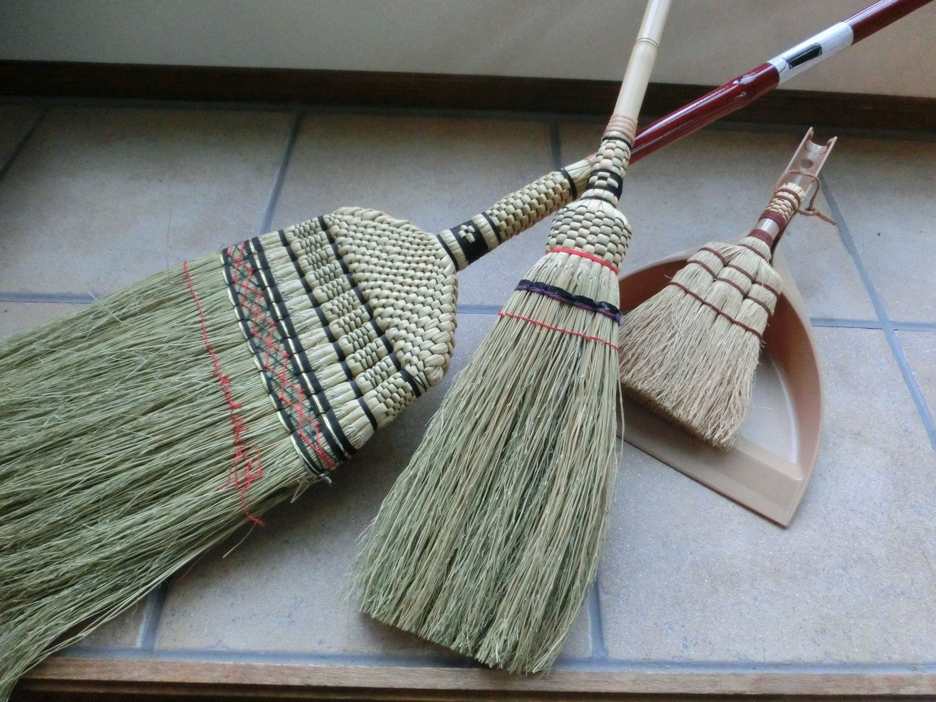 3本のほうきを用途ごとに使い分けて掃除