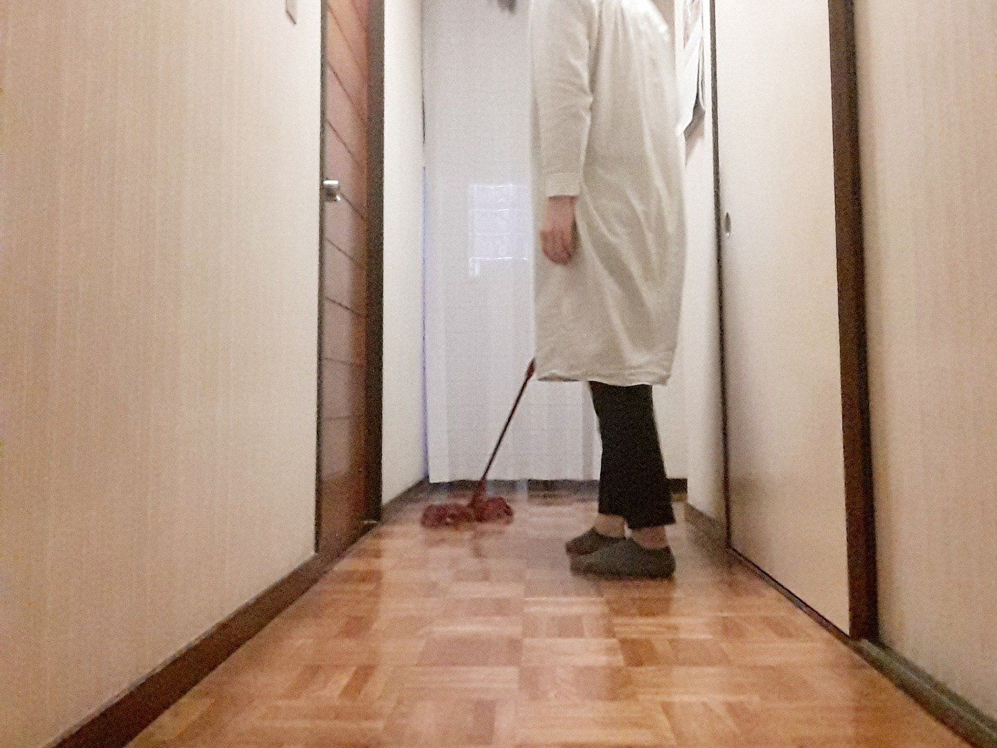karrnettさんは、夜のうちに落ちてきたホコリを朝にささっと掃除をしています。扉の裏にフローリングモップやほうき、ちりとりなど掃除用具セットを準備。すぐに取り出せてしまいやすい場所に収納しておくことで、毎日無理なく続けることができているそうです。