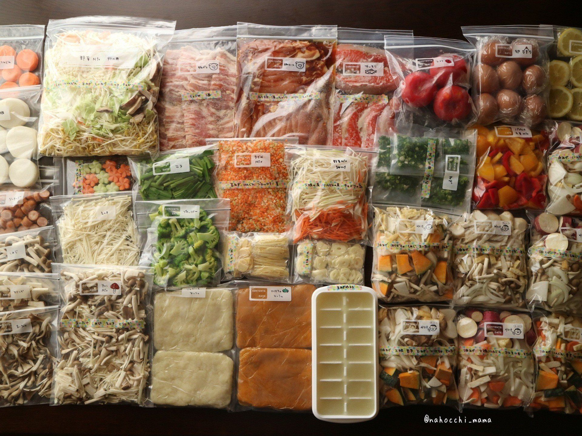 小分け冷凍保存をして作りおきをしているなほっちmamaさん。肉と魚は下味をつけて冷凍保存することで、パサつきを防止。トマトはヘタを取り、卵は一個ずつくるんだらまとめて保存しています。また、味噌汁の具を1日分ごとにまとめて冷凍すると、朝がとても楽なのだそう。