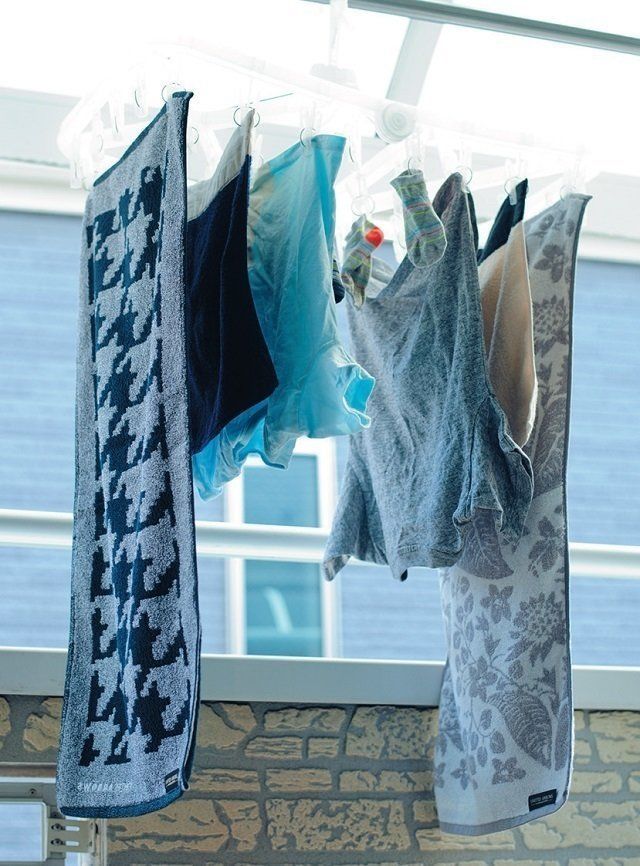 タオルなどの大きいものは外側に、下着などの小さいものを内側に干すと、洗濯物全体に風が通りやすくなって乾く時間も短縮。洗濯後、小さいものが上にくるようにかごに入れると、干すときにスムーズ。