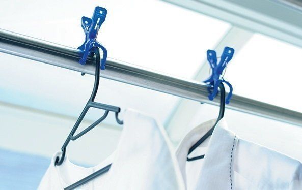 二股の洗濯ばさみでハンガー部分を留めておくと、風で飛んで重なり生乾きになる、しわができる……といった失敗がなくなります。