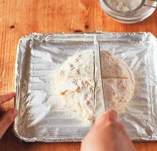 茶こしで仕上げ用の薄力粉をふり、包丁で十文字の切り目を入れる。オーブントースターで15分焼く(オーブンの場合は170℃で20分)。途中で焦げそうな場合はアルミホイルをかぶせる。