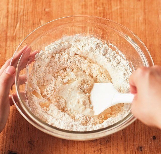 ボウルにAを入れて菜箸で混ぜ合わせ、真ん中をくぼませてBを入れる。ゴムべらで内側から少しずつくずしながら、粉っぽさがなくなるまでしっかり混ぜ合わせる。