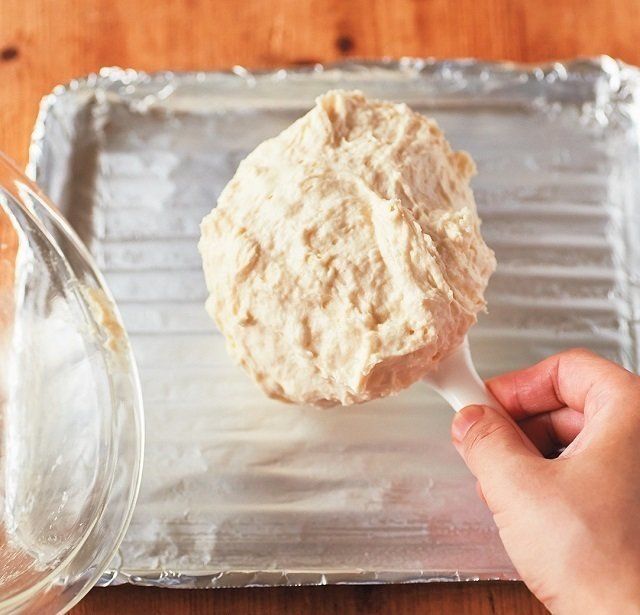 オーブントースターの天板にアルミホイルを敷いてサラダ油を薄く塗り、生地をこんもりとのせる。