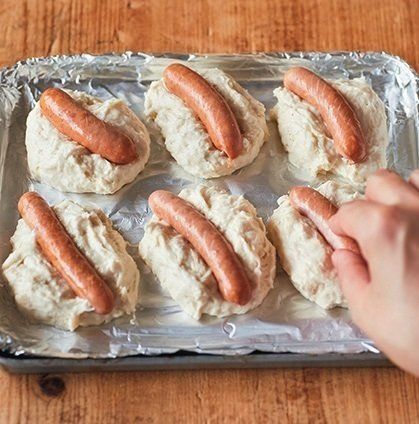 ソーセージ6本に斜めに7~8本切り目を入れる。クイックパンの生地の材料を混ぜ、天板に¹⁄₆量ずつだ円形にのせ、ソーセージの切り目を上にしてのせて軽く押し、オーブントースターで10分(オーブンの場合は170℃で15分)焼く。ケチャップ、マスタード各適量をかける。