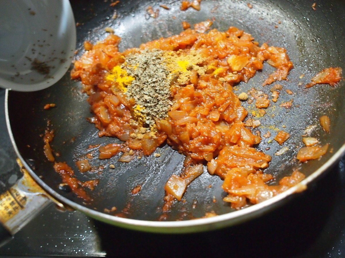 少し炒めたら、スパイスを入れます。慣れてきたらもっといろいろなスパイスを使ってもいいと思いますが、最初のうちは今回紹介した基本の4スパイスを使ってみてください。いい香りが漂ってくるはずです。ここまでくると、まさに本格的なインドカレーといった趣になります。