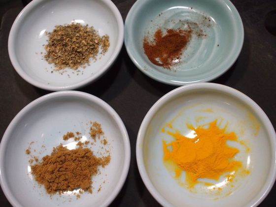 スパイスカレーというと、さまざまなスパイスを準備して臨むイメージですが、今回紹介するレシピで使うのはコリアンダー、レッドチリ、クミン、ターメリックの4つだけ。どれもパウダーです。