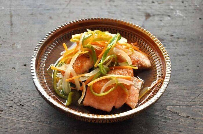 フライパンで焼くだけで、揚げずにつくれる鮭の南蛮漬け。ピーマンやにんじんなどの野菜もいっしょに漬け込むので、バランスのよい食事を楽しめます。冷蔵で4~5日ほど日持ちするのもうれしいですね。