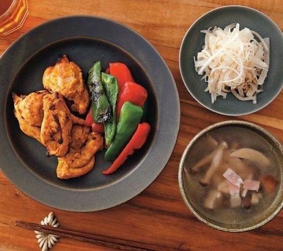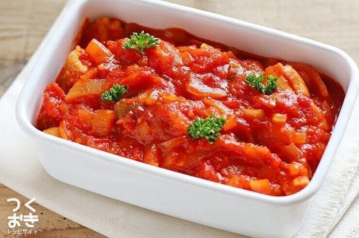 鶏肉・ピーマン・しめじなどを入れた、具だくさんのトマト煮込み。ほどよい酸味とコクがおいしい一品です。うま味が濃縮されたトマト缶を使っているので、味つけが簡単なのもうれしいですね。