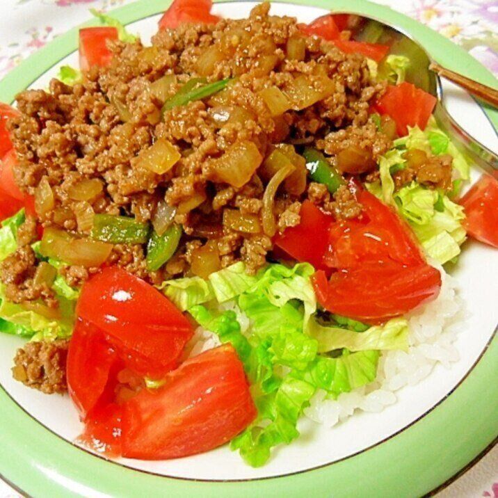 見た目が華やかでおしゃれなタコライスのレシピ。ピーマンは、こまかく切って合いびき肉と炒め合わせます。さらにトマトとレタスも使って野菜たっぷり!ヘルシーな一品です。