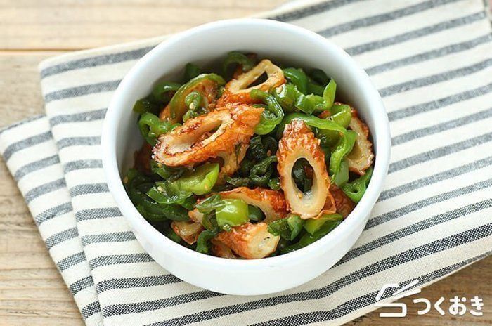 「ピーマンのペペロンチーノ」は、ピーマンとちくわをあえた一品。ニンニクと赤唐辛子を入れて、まるでペペロンチーノのような味わいが魅力となっています。お弁当のおかずにもピッタリですね。