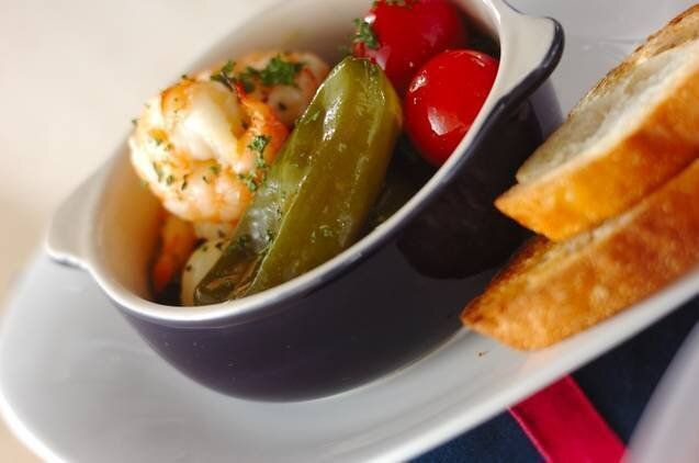 エビとピーマンをオリーブオイルで煮込んだ、おしゃれな副菜レシピ。にんにくやアンチョビのきいたオイルがピーマンにしみ込んで、食欲をそそります。バゲットなどを添えれば、ワインとおともにもぴったりです。