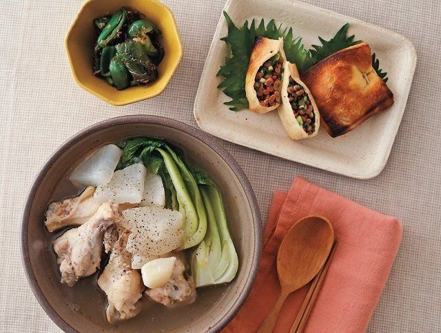 体がぽかぽか温まるみそ汁。ピーマン、ねぎ、えのき、さといもがたっぷり入っています。さといもはゆででぬめりをとるなど下ごしらえが必要ですが、あとは具材を切って煮込むだけの簡単レシピです。
