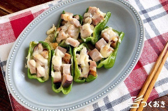 「ピーマンの春雨詰め焼き」は、ピーマンにピリ辛風味に味つけした春雨をつめた一品。春雨のほかにもツナやれんこんなどが入っているため食べ応えも抜群。ピーマンが苦手な人もおいしく食べられますよ。