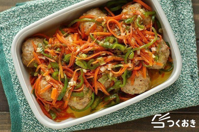 「かくれピーマンの肉だんご」は、一見通常の肉だんごのように見えますが、実はなかにピーマンが隠れています。肉だねのなかにみじん切りをしたピーマンを混ぜてつくっていますよ。ピーマン嫌いの子にもピッタリのメニューですね。