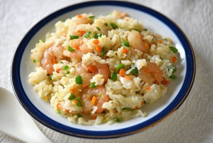 ピーマンとにんじんの彩りがおしゃれな、洋風のえびチャーハンです。油ではなくバターで炒めるので、コクのある味わいに。カレー粉をほんの少しだけ加えると、味にメリハリがつきますよ。