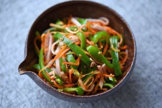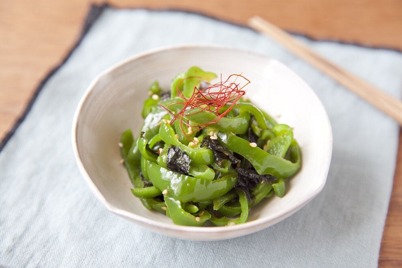「やみつきピーマンのナムル」は、電子レンジで簡単につくれるレシピです。細切りにしたピーマンを加熱させて、ニンニク、ごま油、すり白ごま、塩を和えて完成。忙しいときでもサッとできるので便利ですよ。