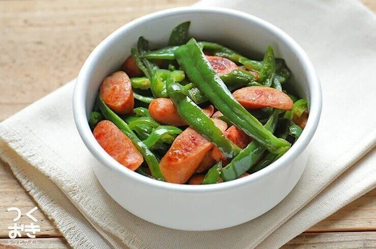 ピーマンとソーセージを炒め合わせたシンプルな一品。味つけもコンソメだけなので、ピーマン本来のクセになる食味や、ソーセージのうま味をそのままダイレクトに楽しめます。