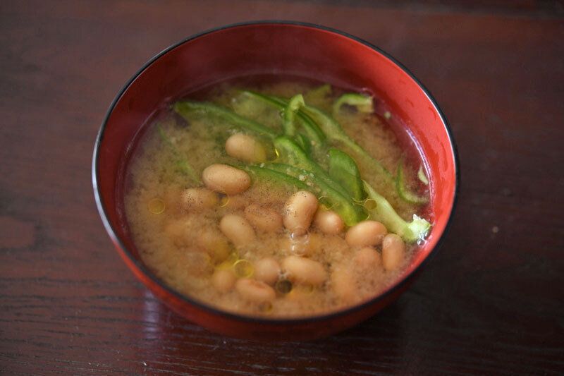 ピーマンと蒸し大豆を使った即席みそ汁のレシピです。具材にだし汁を注ぐだけなので、5分たらずで汁物が完成!仕上げにオリーブオイルとこしょうをプラスすることで、新鮮な味わいを楽しめます。