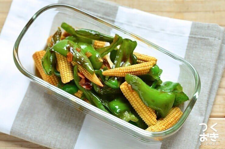 ピーマンとヤングコーンをオイスターソースとともに炒めたおかずレシピ。ヤングコーンはしっかり焼いて、焦げ目をつけるのがおすすめ。香ばしさが増し、よりおいしそうな見た目になります。