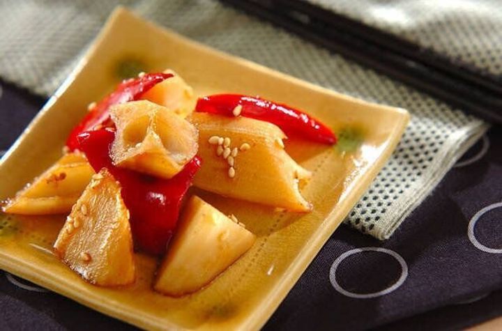 具材はレンコンと赤ピーマンだけ。素材の味をシンプルに楽しめるレンコンとピーマンのきんぴらです。赤ピーマンの彩りが華やかで、お酒のおつまみにもよく合いそうですね。