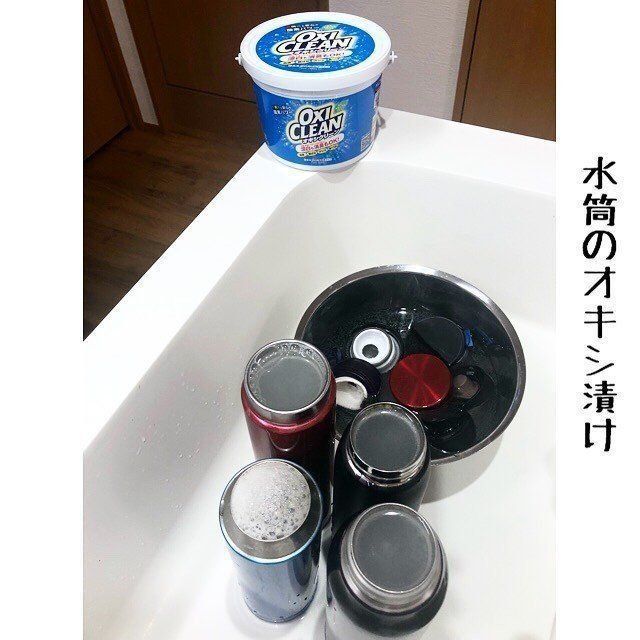 毎日水筒を4個使うというsora07_2019さん宅では、毎日水筒専用のスポンジで洗うだけでなく、1週間に1回オキシ漬けもしているそうです。水筒内にオキシクリーンを入れて40~60度のお湯を入れて置いておけば、底の汚れがはがれて浮かんでくるので、スッキリキレイになってくれるのだとか!