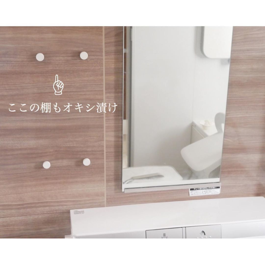月一のオキシ漬けを目標にしているks._.myhomeさん。ゴミ箱掃除と合わせて、お風呂用品もいっしょにオキシ漬けしています。ゴミ箱をバケツがわりにして、シャワーヘッドや取り外せる棚を入れるのだとか。ゴミ箱とお風呂用品が同時に掃除できるので、時短にもつながりますね。