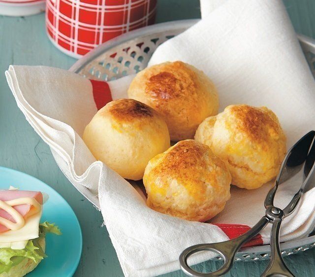 粉をふるい、ヨーグルトや溶き卵を入れて最後にバターを混ぜ、こねてひとまとめにしたパン生地。包丁で6等分して丸め、卵黄を塗ってトースターで焼けば、もっちりパンが簡単にできます!