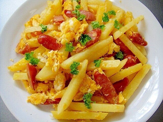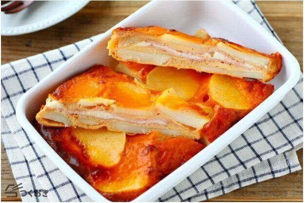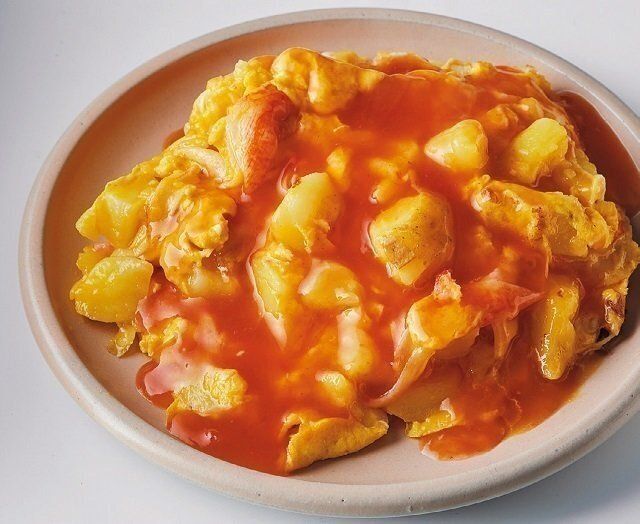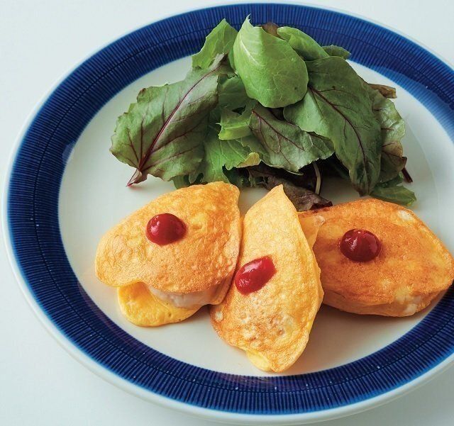 卵、ゆでてつぶしたじゃがいも、かに風味かまぼこを混ぜたらオリーブ油で焼きます。仕上げはケチャップのあん!甘くておいしいので、子どもも大好きな味わいです。