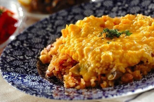 ごはんをつくる時間がない……そんなときは、余った炒飯やピラフが大活躍。フライパンで一気に半熟いり卵をつくり、上にのせるだけ。これなら子どもも喜ぶし、時短にも◎。