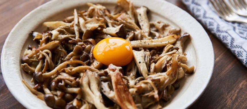 卵黄のソースがおいしい焼ききのこです。きのこは、強火で触らずに焼き色をつけるのがうま味を凝縮するポイントです。舞茸やしめじなど、たっぷりきのこが食べられますね。