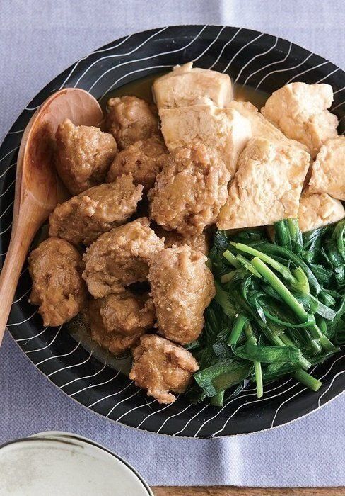 豚ひき肉に、卵、塩、片栗粉でふんわり肉だんごをつくります。粘りが出るまでしっかり練り混ぜるのが、おいしさの秘訣。仕上げに豆腐と煮込めば、豚肉のうまみが豆腐にしみてごはんが進みます。
