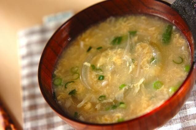 卵入り白みそ汁のレシピです。卵と玉ねぎが入った甘めのみそ汁で、優しい味になっています。溶き卵は煮立つ直前に入れてふんわりと仕上げましょう。最後に刻みネギを入れて完成です。
