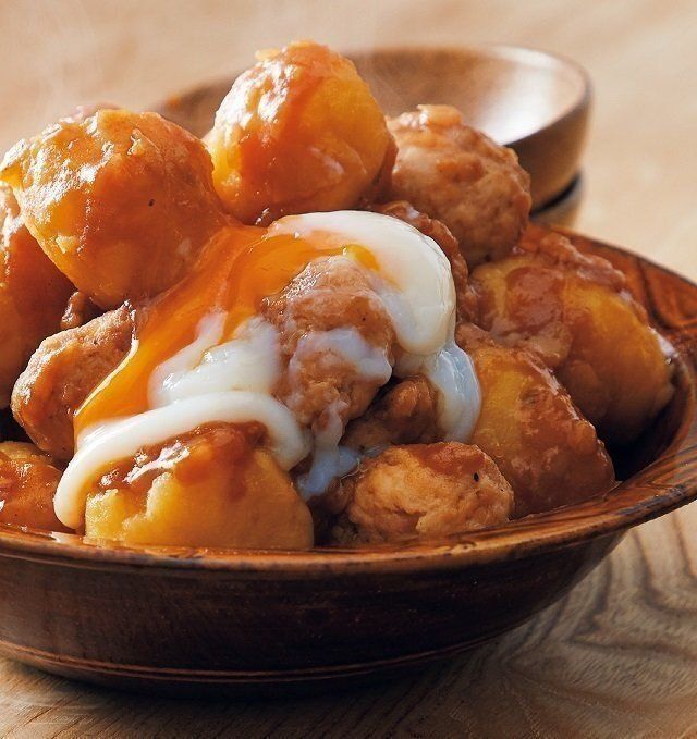 鶏ひき肉でつくねをつくり、じゃがいもといっしょに煮込みます。ごはんにのせたら仕上げに温泉卵をプラス。だし汁ベースのしっかり味で、ごはんが進む!新感覚肉じゃが。
