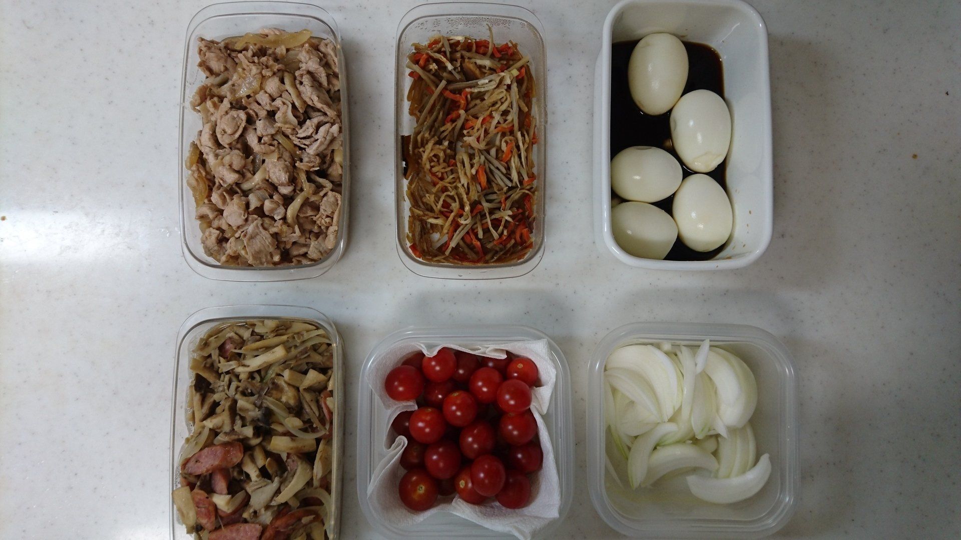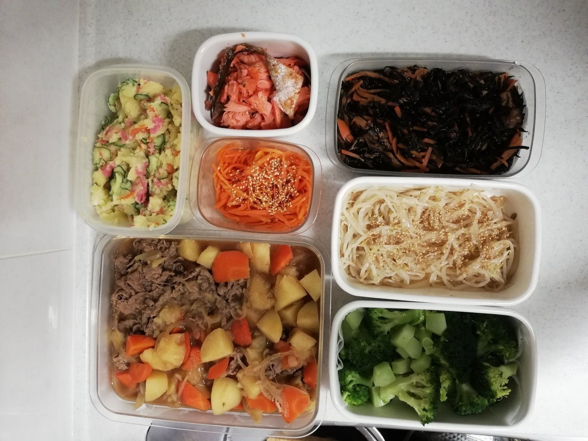 あこがれの1,000万円貯金を達成した節約達人の中野めぐみさんは、週末のまとめ買いと常備菜づくりをルーティンにしています。今回つくったのは、肉じゃが、ポテサラ、にんじん&もやしのナムル、ひじきの煮物、茹でブロッコリー、鮭フレーク。品数を多めにつくることで平日の食事づくりが楽になりますね!
