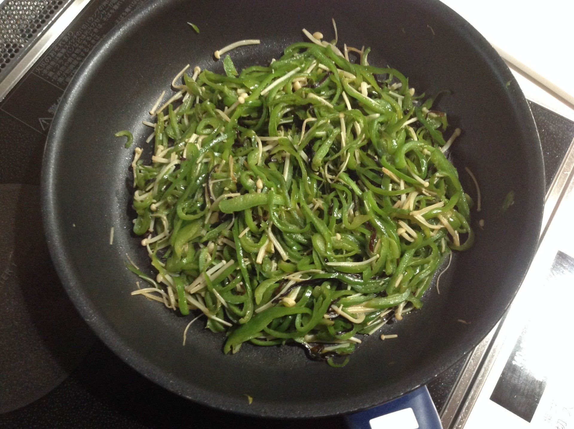 千切りにしたピーマンと石づきを取り半分に切ったエノキをごま油で炒めて軽く塩コショウ→火が通ったら弱火にして塩昆布を混ぜ軽く炒めたらできあがり。お弁当のおかずにも大活躍です。翌日にはトロッとした食感になっておいしいそうですよ。