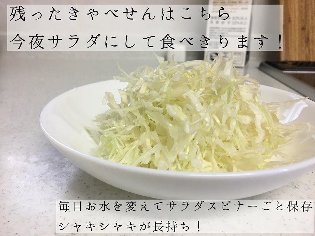 また、megum.nakanoさんはキャベツの千切りも常備菜として用意しています。毎日お水を変えてサラダスピナーごと保存することで、シャキシャキした食感を長持ちさせることができるのだとか。買わないではなく、捨てないことを目標に日々節約しています。