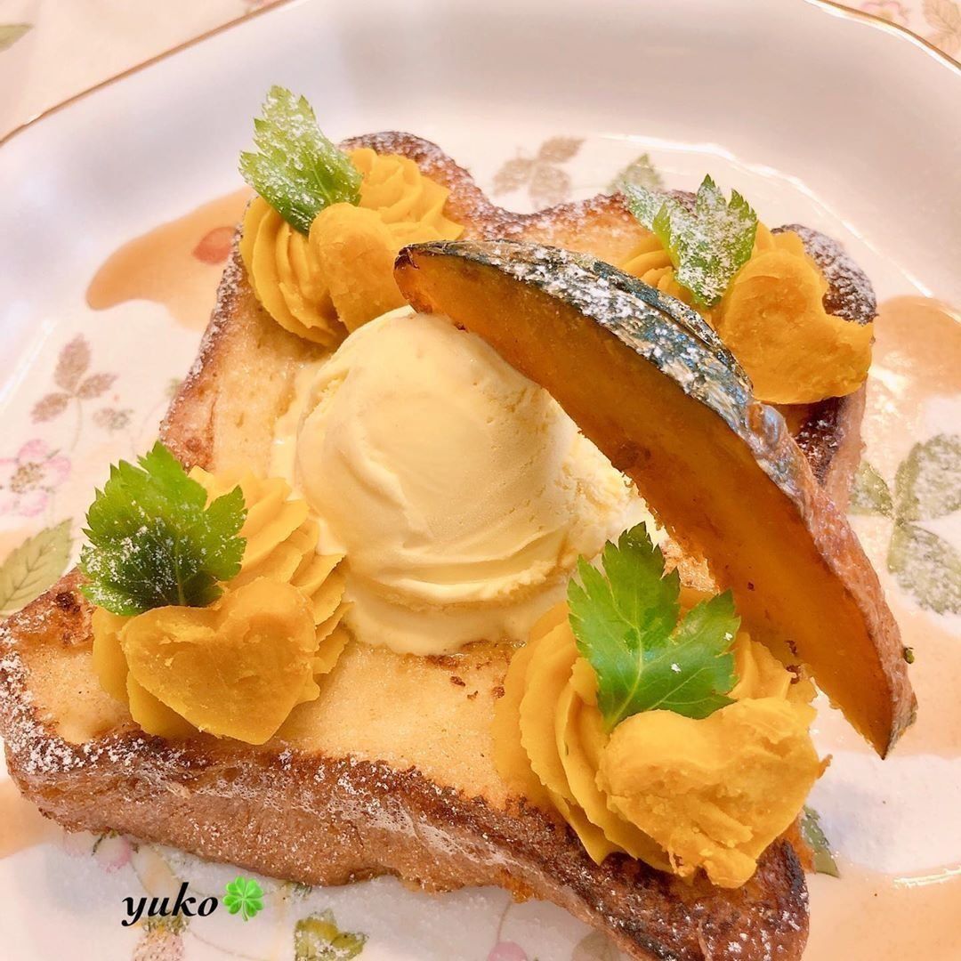 yuko__1014さんは、お家でパンプキンモンブランのフレンチトーストを調理。かぼちゃのワタを取って電子レンジで4分ほど温めたら、バター、砂糖、生クリームと一緒によく混ぜます。ハート型の飾り用と素揚げ用のかぼちゃはわけて保管しておきましょう。裏ごししたら絞り袋でモンブラン風に飾り付けたら完成です!