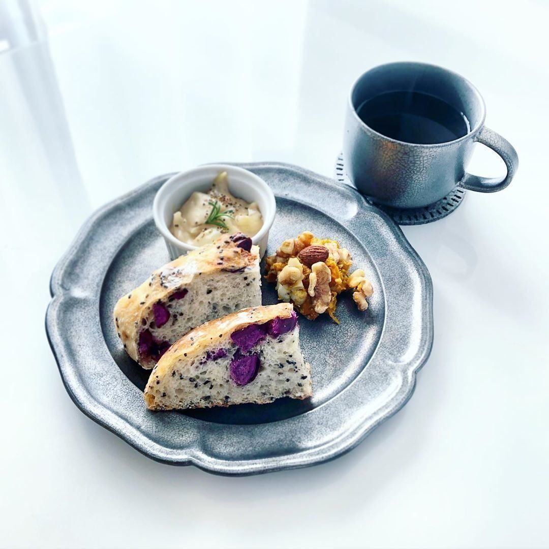 lilymamanさんは休日の朝ごはんに、こねない生地でつくるさつまいもと黒ごまのカンパーニュを焼きました。カンパーニュとあわせて、前日の残りのクリーム煮とかぼちゃサラダもチョイス。お家でカフェ気分が楽しめるすてきなメニューですね!
