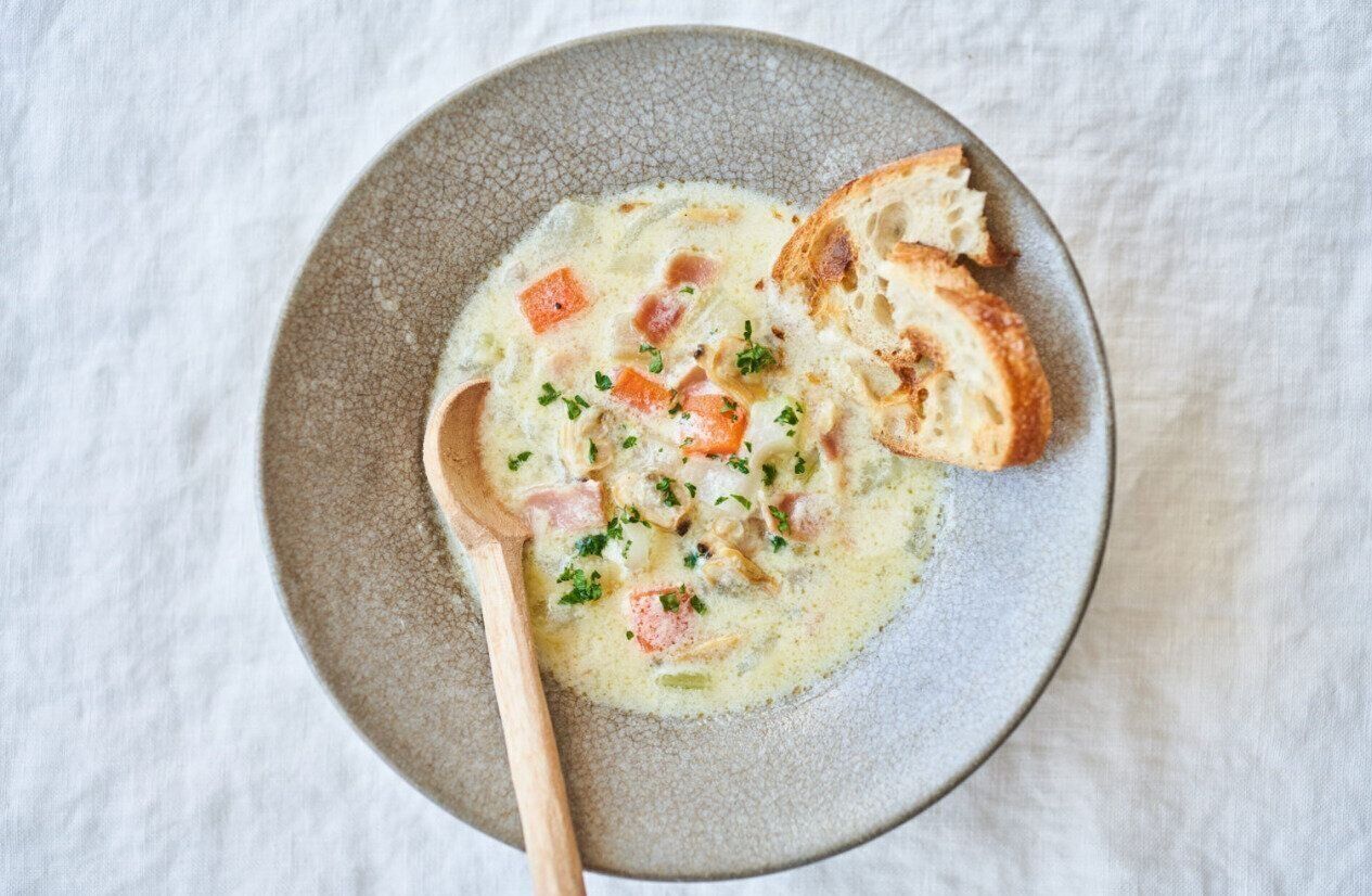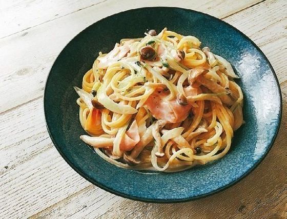「週に1回は丼や麺にする」「市販品を活用する」など、割り切りデーをつくるだけで、毎日のご飯づくりがグッとラクに。しめじ、ベーコン、玉ねぎなどを炒めて、牛乳、和風だし、塩、こしょうで味つけ。ゆでたパスタを加えれば完成。あとは汁ものとサラダで、パーフェクト!