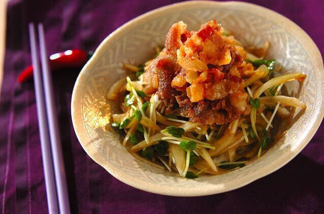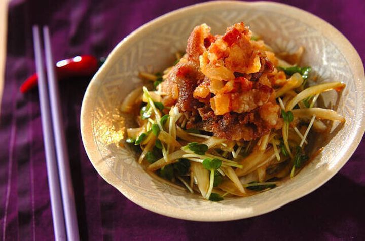 フライパンで揚げた豚肉の食感もポイントの、豚肉と玉ネギのカリカリサラダ。手作りの「ドレッシング」やレモンの風味で、さっぱり食べ進められそうです。お好みで野菜をアレンジするのもおすすめですよ。
