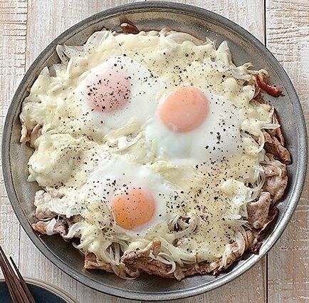 こま肉だけでなく、ひき肉も「味つき冷凍肉」をつくっておくと便利です。こちらは「豚ひき肉のコンソメだね」を使った一品。凍ったひき肉だねを割り入れ、蒸し焼きにするだけで、ふっくらジューシーな仕上がりに。