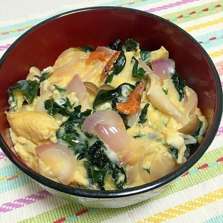 たまねぎをたっぷり使った、ヘルシーなわかめ丼のレシピ。わかめの塩加減と桜えびのアクセントがマッチし、おいしさが引き立てられますよ。白だしで手軽につくることができます。
