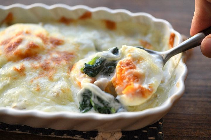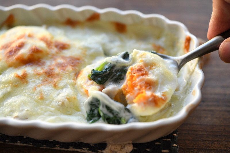 寒い日もほっと温まりそうな、ほうれん草とゆで卵のグラタンのレシピ。ほうれん草やゆで卵、玉ねぎに鶏もも肉も使った、具材感もポイントです!鶏肉の代わりに、ほかのお肉や海鮮を入れるアレンジもおすすめですよ。