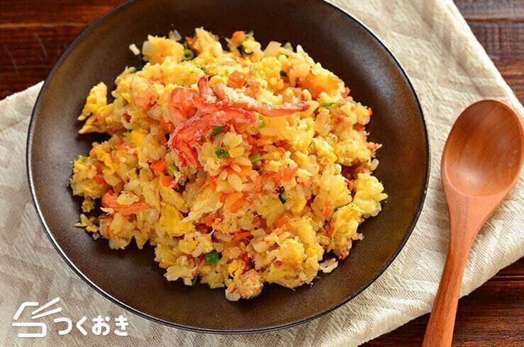 彩りがよく、お弁当にもぴったりの具だくさんカニチャーハンです。フライパン1つでつくれるので、片づけが少ないのもうれしいポイント。玉ねぎやカニのうま味がたっぷりで、子どもも喜ぶこと間違いなし。