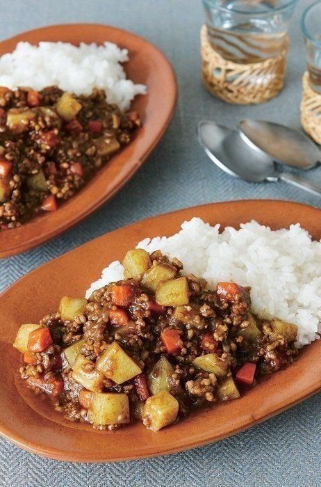 カフェ風カレーの定番、ドライカレーをおうちでも楽しみましょう。一般的なドライカレーは、野菜をすべてみじん切りにしますが、こちらのレシピはじゃがいもだけ切り方を変えてコロコロとした形に。じゃがいもの食感も楽しめて、満足度もアップ♪