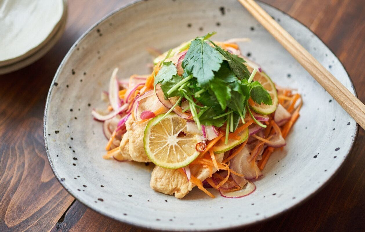 こちらの鶏ハム香味サラダも、同じく安ウマ食材の鶏胸肉を使った時短レシピです。鶏肉に調味料をすりこんで寝かせる必要はありますが、そのあとはフライパン1つであっという間に完成です。余熱で火を通すから、パサつかずしっとりした仕上がりに。