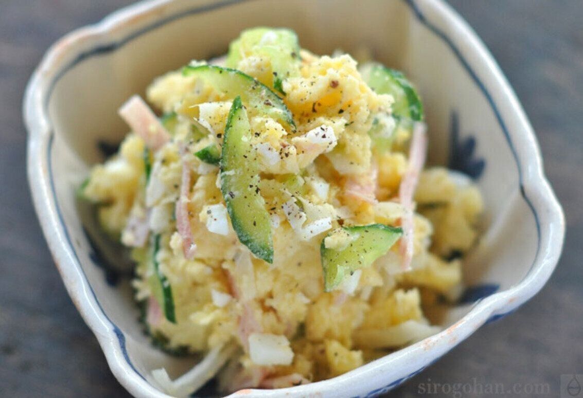 玉ねぎ、卵、きゅうり、ハムなど、基本的な具材と味付けで作りやすいポテトサラダのレシピです。じゃがいもは塩で茹でてさっぱりと。玉ねぎやきゅうりも下ごしらえをして辛味や食感を調整します。お好みで野菜を足すなどアレンジするのもいいですね!